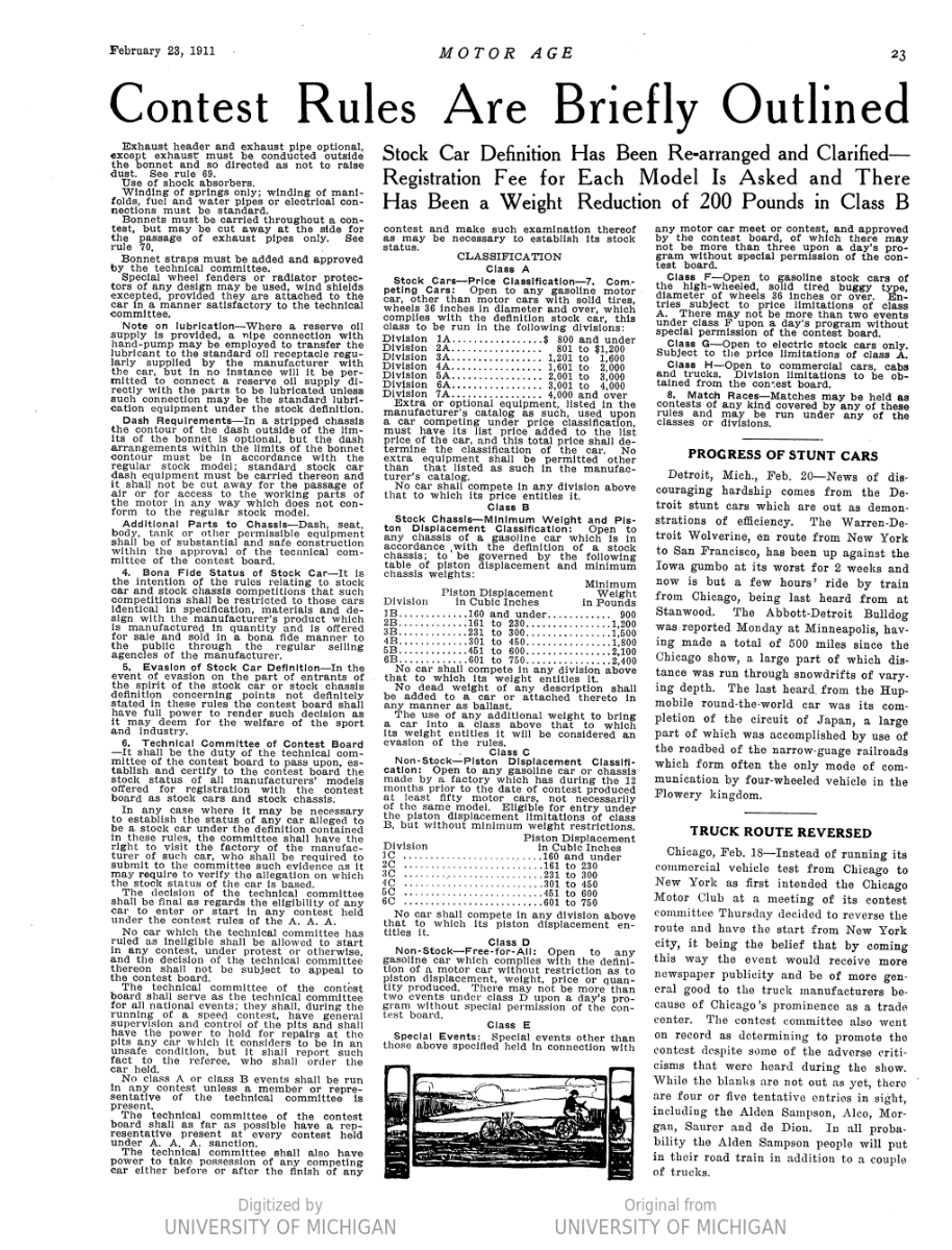The “Drivers and Card Entered in Meet” lists of cars and drivers, Light Car Division entries, includes the two Ford sponsored racers. Their displacements are confirmed in the bottom paragraph of the same page and column. In the paragraph including the phrase “When it comes to grading of cars…”