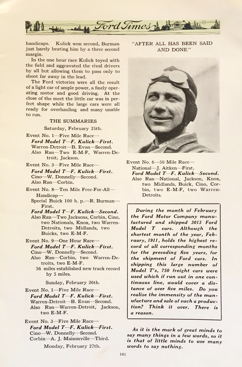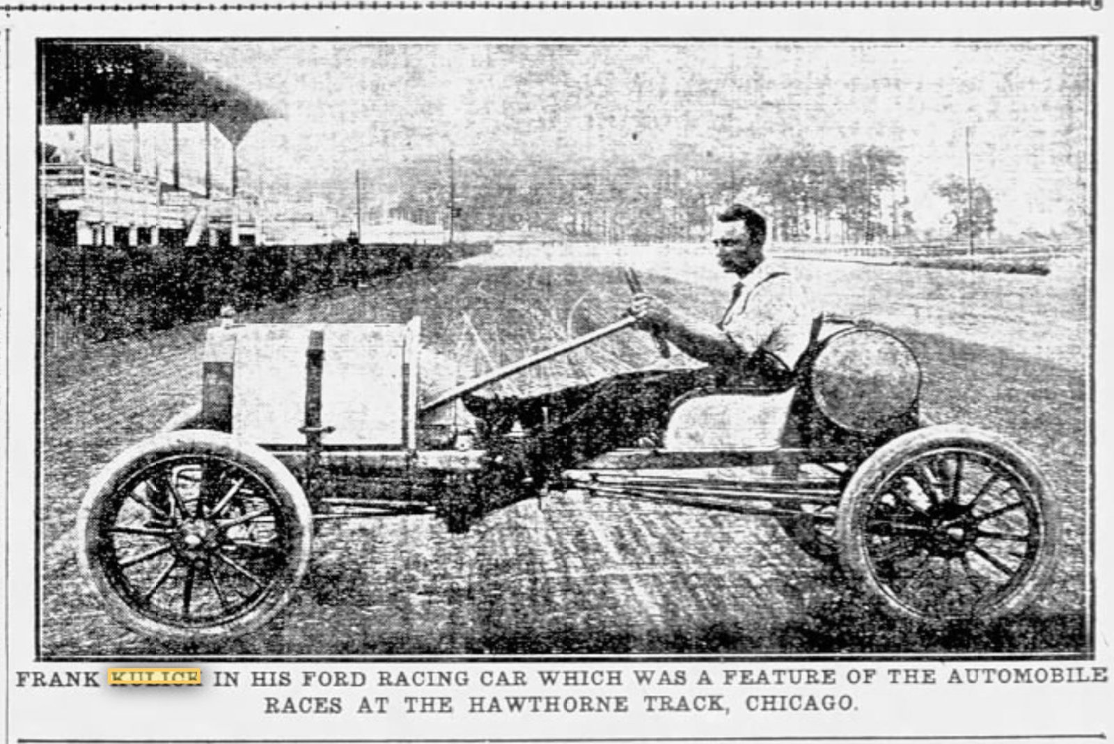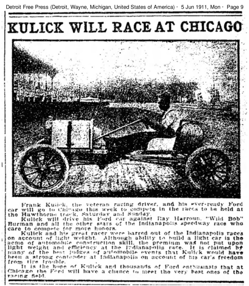 In 1907, when Frank Kulick went through the fence during an attempt at the one mile world record with Henry Ford's six cylinder racer, Ford left track racing. Following the Ford victory in the 1909 Ocean to Ocean race, Henry Ford said he would re-enter competition. It took a year, but in August a little Ford showed up at the Brighton Beach track, and began to make a name for Ford in racing circles again.