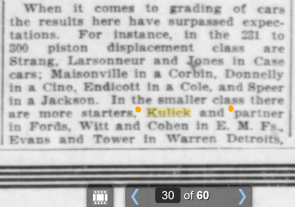 As mentioned, if moving a Ford to the upper class occurred to make a race card of three cars, it didn't happen until at least the day before the races. If that were the case (pun intended), I suspect the press would have brought that into the discussion. Another point giving us a "clue" may be that Ford did register two racers. As seen with the Strang/Case team, if a car maker entered two racers, it was expected that both race. Ford did indeed enter two cars, paid two entry fees, and I don't see why they would have risked sanction, wasted fees, and not race a car. I believe two were sent, with the intention that Frank Kulick would drive each, in two classes. And that appears to me to be what happened.