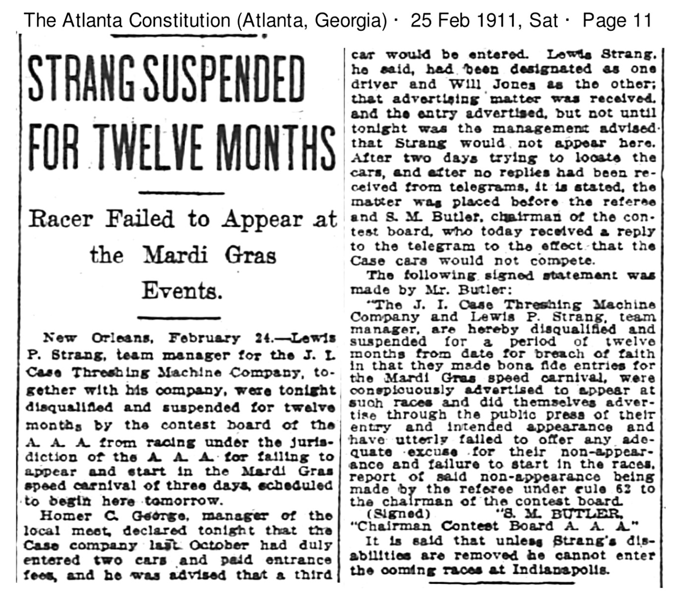 This article that appeared the day of the races reports the racing committee wasn't aware the Case team wouldn't appear until the night before, and were promptly banned from AAA sanctioned races for a year: