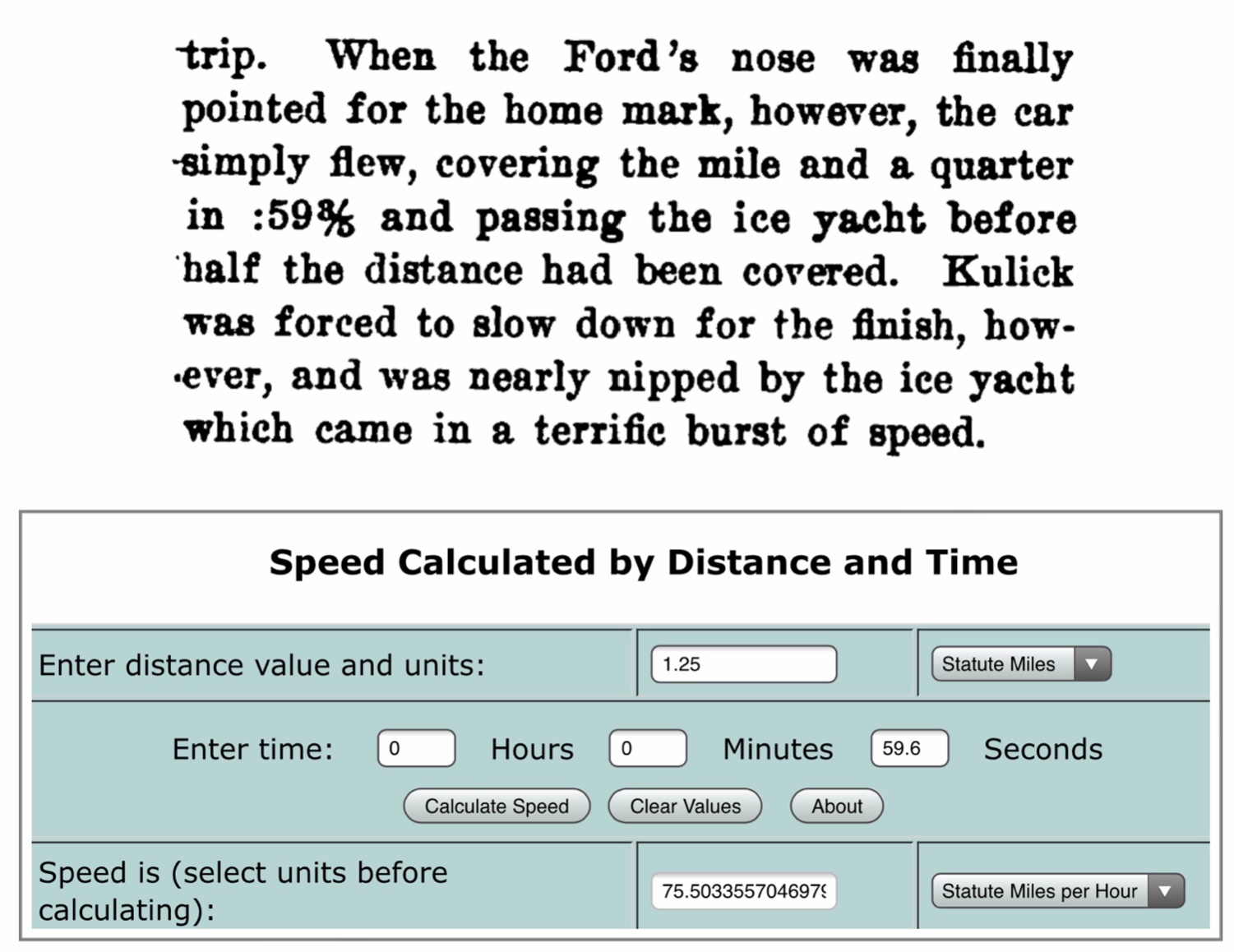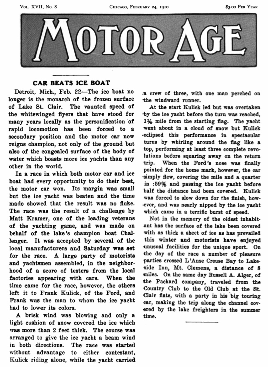 The reason I believe this is the first “sighting” of a Ford special is due to the speed the Ford is reported to reach during the race with the ice boat, 75.5 mph: