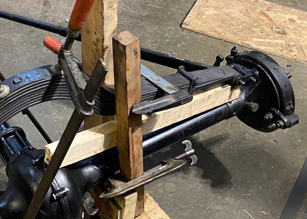 Particularly helpful IMO were the 2x3 under the two shackle eyes, and the vertical 2-bys that held the spring and the 2x3 in alignment.