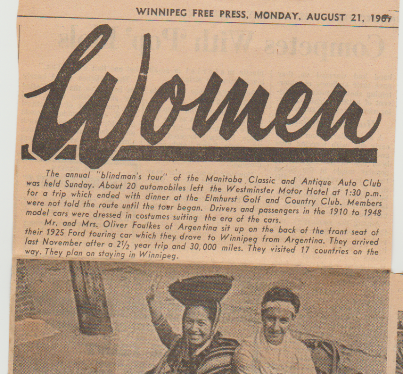 There was a 1920s Model t touring in Winnipeg in the mid 1960's it was driven from South American through the states and wound up in Winnipeg. I was just a kid but I remember the car and the if memory serves me correctly it was Oliver and Bertha Foukes the car was a yellow body with red fenders later they moved to Toronto. I will look for pictures.