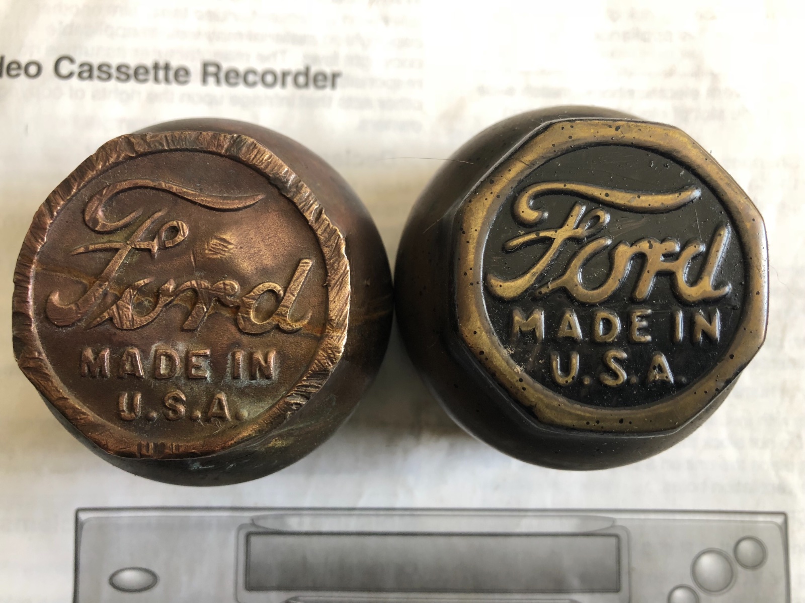 I think the one on the car is original, given the clean definition of the letters, and the four brass ones are reports, given the less clean stamping and differing 'made in' font. Do you guys agree?