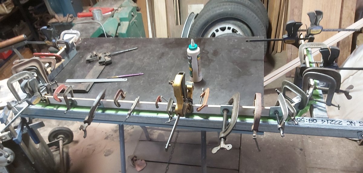 I started by clamping the bundle in the centre of the former, and worked outwards to the corners. The pistol type clamps were used to start the bends, followed by a G clamp to hold it. Then the pistol clamp was refitted further round the bend, followed by another G clamp. Working alternately at each end, and working progressively around each bend, it all worked remarkably well. One can never have too many clamps. The proof will come tomorrow when I take the clamps off to add more strips to the stack. All up I will need eight strips to make the bow a match to the broken one.