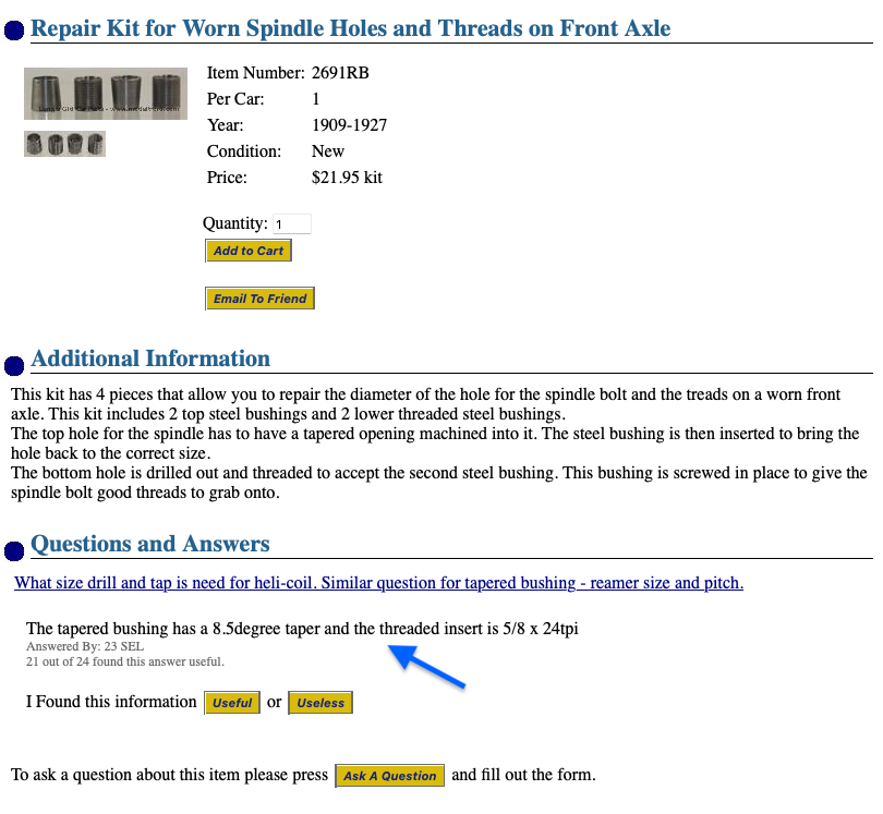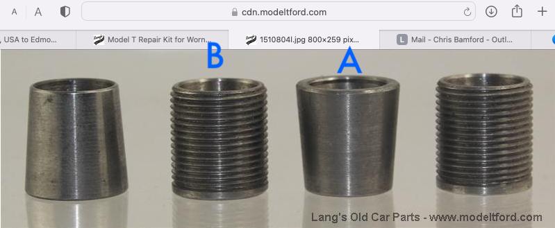 These tools worked pretty well for me, and they were used to save a couple of scarce early front axles. Later on I bought a set of Dan’s reproduction reamers, probably from Lang’s, and have used them and the new top and bottom bushings since.