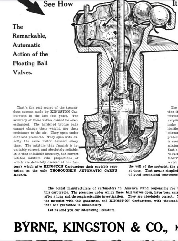 I've found that the 5 Ball Kingston was one of the best of the early carbs of that period. They were very popular on many styles of engines including the big prairie tractors of that era and were known for their responsiveness with varying loads. When these tractors were running sawmills, they had to go from a very lite load to maximum output almost instantly and the Kingston was one of the few carbs that could give that kind of performance. Of course, they were also used on many of the cars in the early years for the same reason. Before the development of carbs with accelerator pumps, Kingstons were one of the best designs to handle the rapid demand changes of engine load. After all Henry must of liked how they performed using 5 Ball (and later 4 Ball) Kingston carburetors on Model Ts from 1908 thru 1913. I'm guessing that Rob's specially built racing engine would likely have use it too and once they get it correctly rebuilt and dialed in, he will be happy with its performance.