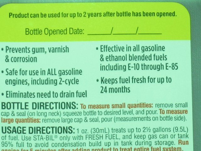 The label on the bottle says "UP TO 24 MONTHS". If I am going to store something for 2 years, I would definitely drain out the gas.Peter, Memphis TN wrote: ↑Mon Apr 29, 2019 9:24 amBoth claim to stabilize gasoline in the tank, although neither says how long.