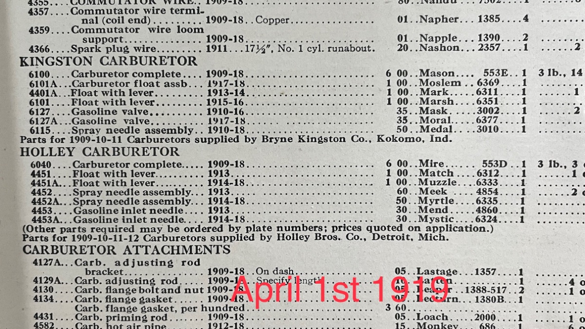 Just perusing a late teens Ford parts book, a foot note of the carburetors, if you required more parts for your 1909 to 13 carburetor that Ford did not supply, you are directed to purchase of what was needed from the, Holley Kerosene Carburetor Co. :