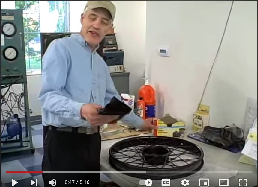 1915 Touring wood spoke clenchers non-demountable wheels. Hello. When I replaced all of my tires about two years ago, I too tried all of the tricks and none worked for me. The garbage bag was the worse! (Again, FOR ME) I started by removing the old tires which had to be sawed off. I agree with Steve Jelf, I bought flaps but did not use them. I used MOTORCYCLE RIM STRIPS. Buy the largest size your local motorclcle shop has. Keep your new tires warm by keeping them inside. (The wife will love this step!) Start by leaving the wheel with rim strip in place ON THE CAR. do one at a time. Put the new tube in the new tire and use a little baby powder and inflate the tube fully.(leave the valve core IN) Jack up only the wheel you are working on just far enough off the ground to get the tire and tube under it. Position the valve stem hole of the wheel on the bottom. Put the new tire and tube in place and direct the valve stem with both beads in place on the rim. NOW here's the tricky part. SLOWLY lower the jack just enough so that the inner AND outer beads with the valve stem sticking out and the bottom sidewalls are squashed enough so that the whole wheel and tire wont rotate. (It's a good idea to put a valve stem retriever on the valve stem so it won't fall inside the rim) I used Go-Jo hand cleaner for lube on both beads. Using two Harbor Freight cheap chrome LONG tire irons and work both beads at the same time starting at the bottom of both sides and the should slip right on with no problems. I then removed the valve core and put a little air in being very careful not to let the stem slide in. I did this step three times to insure the tube didn't have any folds. I then inflated to 60-65 lbs. I drive my car a lot and had no problems using this method. Try not to do any HARD braking until the Go-Jo lube dries up. I hope this was helpful. bobt