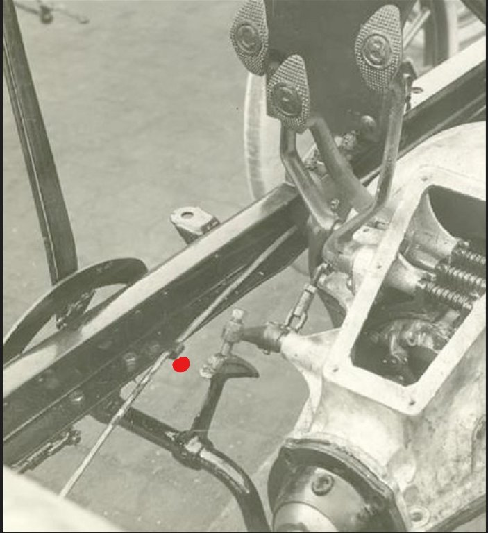by the photo at the red Dot. It slides forward through the hole in the wood engine mounting block.