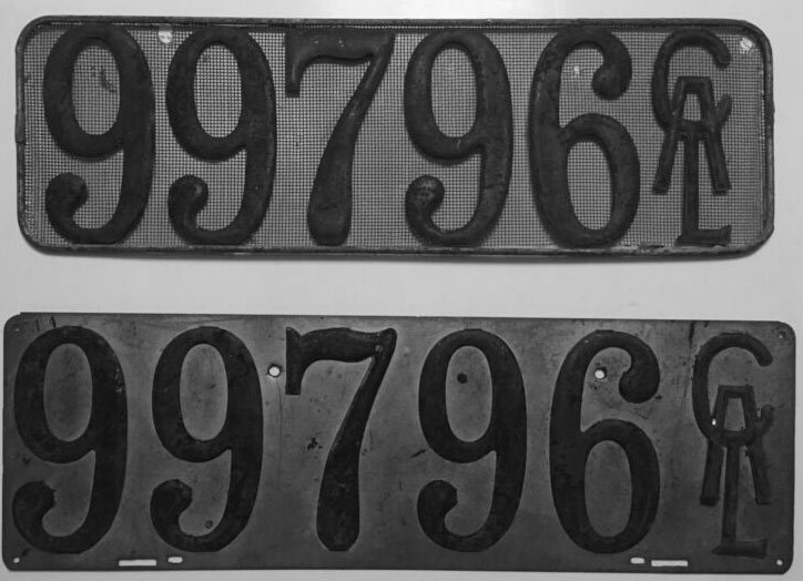 The license plate fits that time frame. Owners were required to provide their own plates until 1914 when the state started issuing them. This example has a screen the numbers are mounted to for the front letting more air through. The numerals are certainly similar. Perhaps house numbers.