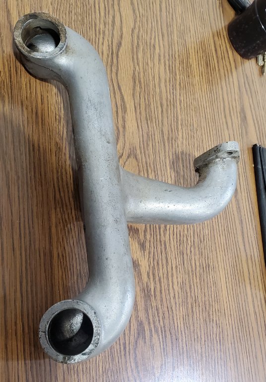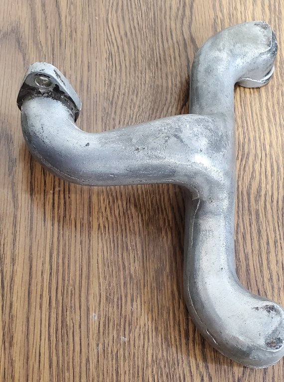 Intake manifold was “dog-legged” aluminum. Exhaust pipe fitted into the exhaust manifold and had asbestos packing, secured with usual nut.
