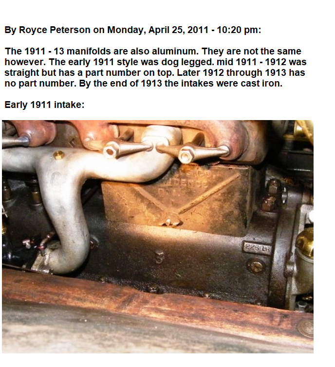 I had this intake on my 1911 open torpedo which was built about 3rd week in Oct. I have known this car since 1982., now I own it this intake has always been on it. Is this correct? And this intake has no part number on it but does not look like the reproductions I have seen. the casting is smoother then any of the repros. Any info would be appreciated.