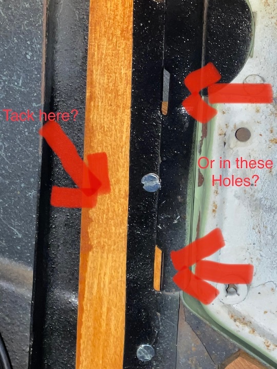This is a picture of the driver's side rear side panel area. (where the door latches) If I put my tacks that hold the interior panel on the main part of the wood they will be about an inch from the edge. Or are the tacks supposed to go through the holes in the metal and then into the wood?