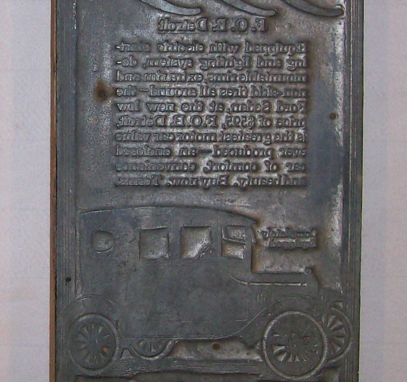Wonderful to see, flat bed press blocks. Think of the progress in typography. Some of these might have formed up pages composed with loose type; most likely with line-o-type. Next came the rotary presses, Ford would have provided fiber composite "mats" of their ads to cast the hot metal plates for the press rolls. The "hot metal" presses were made obsolete by offset lithography which only required "camera ready" copy to drop ads into newspaper pages. Now we've advanced so far that newspapers, like the dinosaur, are heading for extinction.