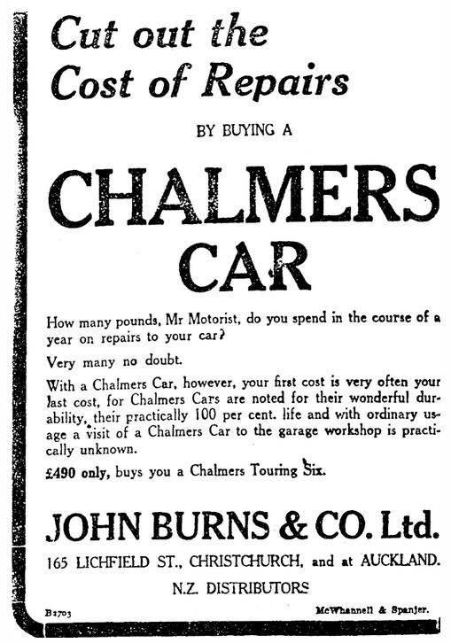 The last new Chalmers I can find (in South Island NZ) is retailed by Haworth & Thomas of 160 Tuam St in 1925. This is a '5-Seater Sports Model' with 5 wire wheels, bumpers back and front, and a luggage carrier rear. It is available at a 'very low price - £425'.