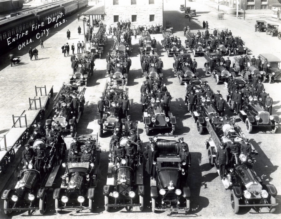 Here’s a photo of the entire Oklahoma fire dept. That’s what it says on the photo anyway. I don’t see a T in the Fire dept cars or trucks. Maybe they didn’t want one.