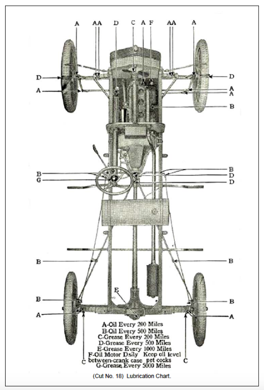 I just oil every flip top and screw down about a turn on each grease fitting. Remember the ones under the front floorboard. Sometimes you can reach them from under the car without removing the floorboard. There is also one through the frame over each end of the parking brake cross shaft. I do this before each time I drive the T unless I drive it every day. Then Once a week if I drive every day for more than a week. Also remember to check the oil every day or every time you drive the car. It can creep down on you and cause engine problems. And a couple times a year the differential oil. If the differential leaks, check it more often.