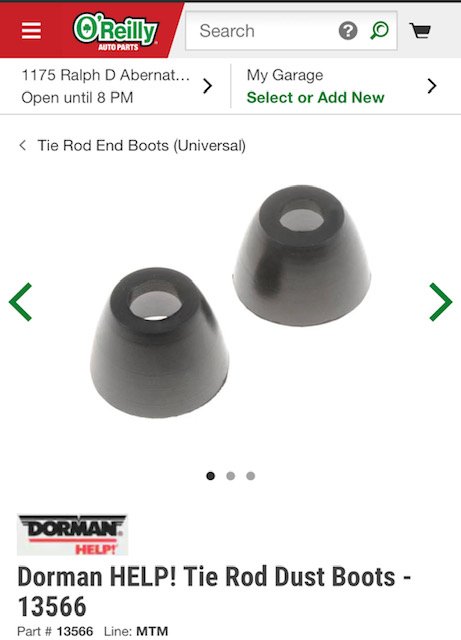 I neglected to post the part number and source for that replacement rubber boot. I bought them from O'Reilly auto parts, but they are made by Dorman products, and one should be able to find them locally, just about everywhere. As I said before, you have to enlarge the small hole in the end with a gasket punch and a hammer to get it to pop over the ball.