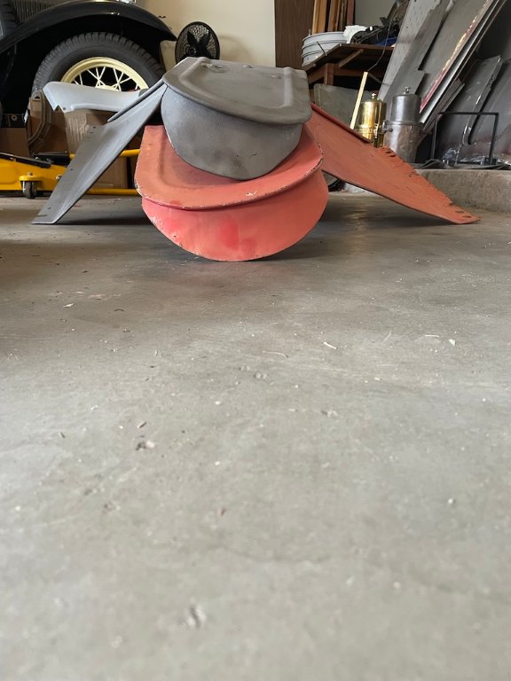 Hello, I have a 1915 runabout that needs a right front (passenger side) fender. I have what I think is a correct left fender, with three rivets, a bill, and a flat top. A friend brought me the red fender, which also has three rivets, thinking that it was what I needed. However, as you can see in two of the attached pictures, it is wider than mine and has a bill that is shaped differently. I am thinking that the red fender may be off of a speedster or a torpedo. I would be very grateful if anyone could solve the mystery.