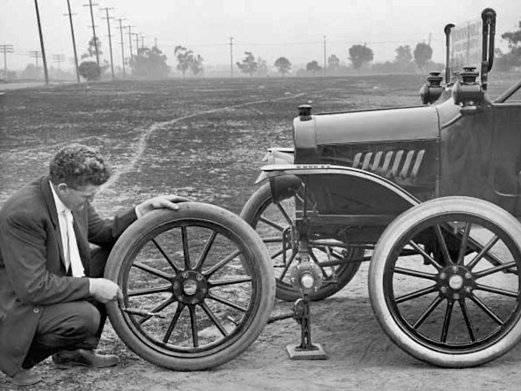 Those things that look like valve stems on the wheel of the 1905 Ford are chaplets. They are wedges inside the tire that wedge the beads into the clincher rim. They were common on early cars up to 1907 or so. Until they finally decided they weren't nessary.