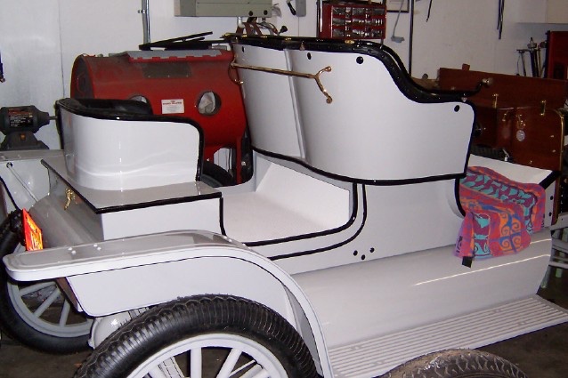 This runabout is likely early, and likely prior to JUNE 1909, as the paint is gray, the nice Dove gray. Note the body does have the black painted carriage bolts securing the bracket for a buggy rail, as those brackets are part of the body, under the upholstery, but the buggy rail for the top fitting is missing.