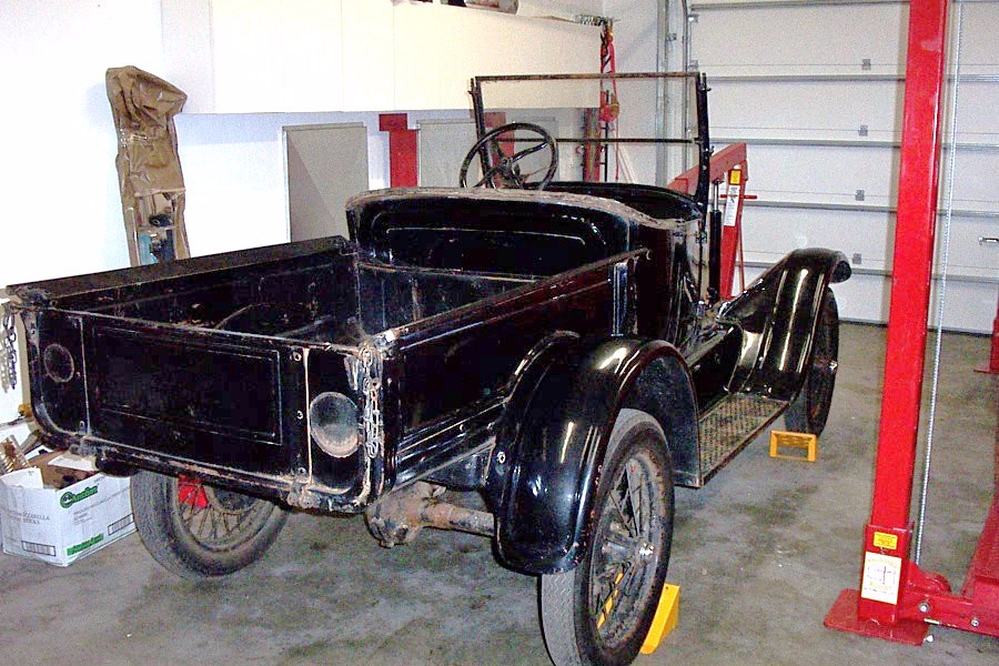 I would like to know if the body shown is a roadster or roadster pick-up. If one looks at an area in back of the round wood post holding the body at an angle (a couple of feet back) there is a hole in the subrail. I believe this is for one of the rear fender fasteners. There is another "bun panel" which has a vertical embosing and is shorter than the one shown.