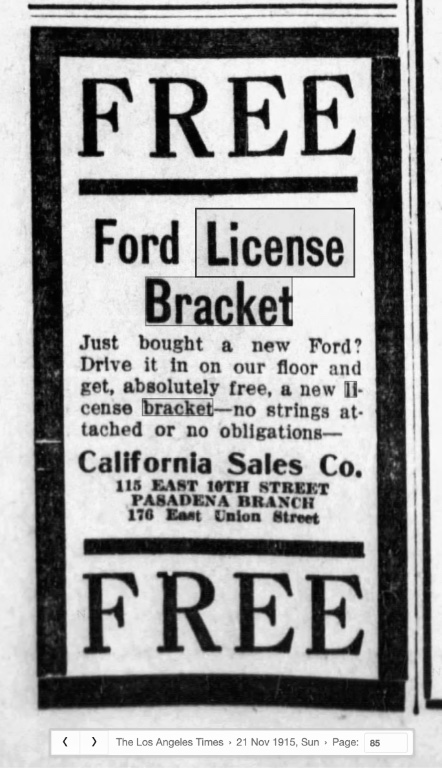 The 1916 California plates are smaller, and I think the state's network of Ford dealers may have lobbied for this in some way. With nearly half the cars in the state Fords, they had considerable clout. Auto supply stores advertised license brackets for Fords, but with no clear evidence for the rear bracket design, if any.