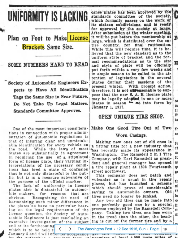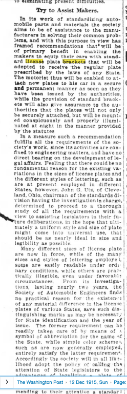 This article from December 1915 describes how standardization committees were moving towards establishing standards for both license plates and mounts, which would in theory be adopted by all domestic manufacturers. They wanted plates to be simple to put on, held securely, clearly visible and illuminated, and easily read, regardless of state, and that this would come into use by 1917 or so.