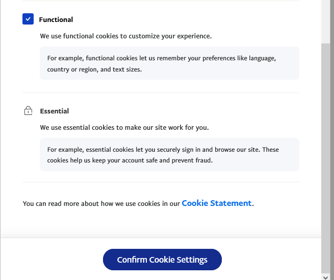 so if you click on Learn more and manage your cookies this menu would appear (other sites may have a slide bar instead of a check mark) so once your choices are made you would click on Confirm Cookie Settings --
