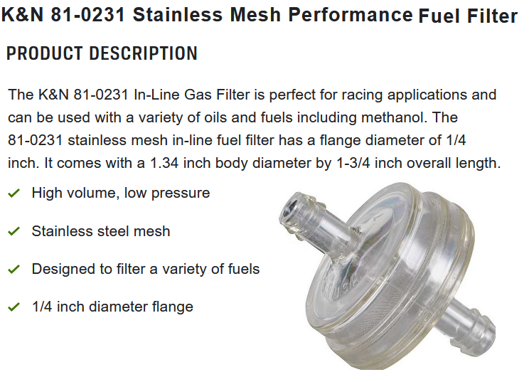 "I put a temporary fuel filter in the line. It is a riding mower filter so it is a little higher flow than some."