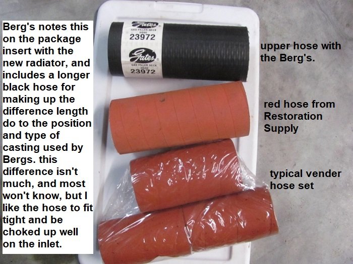 Pictures help to understand (found some). I also have a Berg. I just tried to fit an older red hose to it and it fit nicely. I then tried a recent repro that was a darker red and it felt a bit loose on the radiator but not the water neck. Need to find the black hose that came with the radiator.