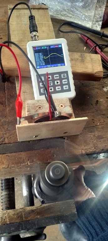 Apparently he didn't have a 'scope, or at least that was what I interpreted the response to mean, however I remembered that some time ago I'd purchased a small 5MHZ device to carry around in the car, which was with me; I had an idea we could make up a small jig to test his coils using this and whatever else was laying around the workshop.