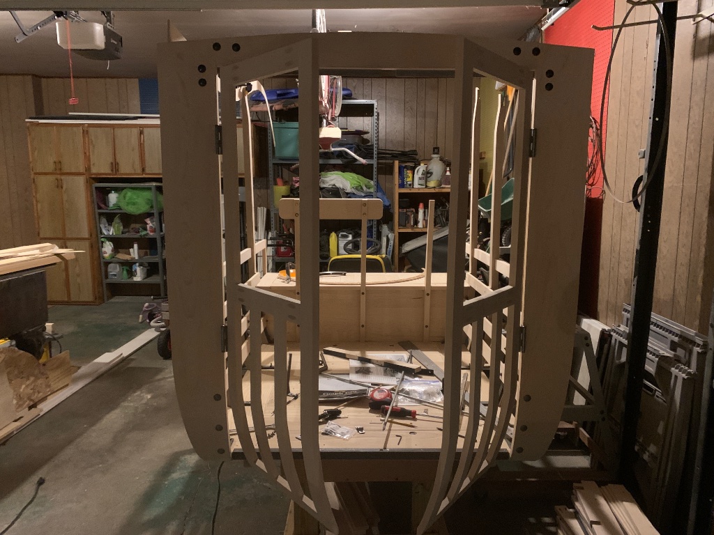 It has gotten to be more work than I had hoped. Since I don't have a giant press or steel made specifically for stamping, I have to relieve the sheet where it curves. I cut out shapes to form a trough to press the sheet into. The I used some cardboard to make a template. I used 3 c-clamps to press it. The inside wants to stretch, and the outside wants to compress. I saved the notches from the outside to trim and silver solder to the spaces on the inside. As it turned out, I needed notches for the outside too. I made some folded clips to hold the notches in place. However, the silver solder migrated up and under the clips. I had to grind them away. It did show that the silver solder flows well holds things together. I have at least 24 hours in this so far. A shop charging $50 per hour would have $1200 so far. This is only the inner half, and I want two of them. So the economics of making them is kind of silly. But my time is my own and it is cheap entertainment. Like many things, I don't know if I will continue these until completion. But it is keeping me out of trouble.
