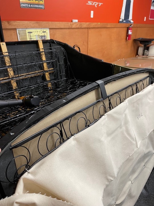 Generally the backrest spring will contour to the curve of the seat back when you stretch and tack the upholstery cover. Be sure to first fit the padded hip panels to the left and right.