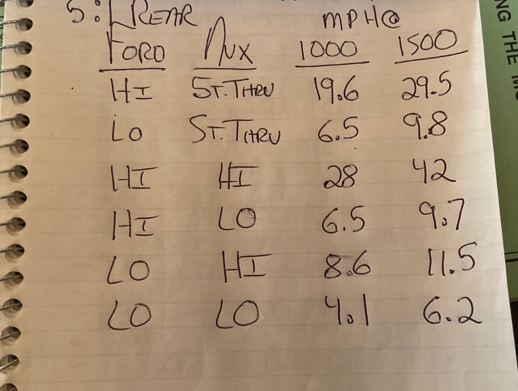 I guess my brain is in a cloud this morning. Im trying to determine or confirm the approx ratios of my TT Auxiliary transmission and then approx mph per/1000 engine rpm based on rolling radius of my tires. One rear tire is jacked up with a flag attached so I can see one revolution while hand cranking with the spark plugs out. I am making the assumption that I have the slow TT 7:1 final.