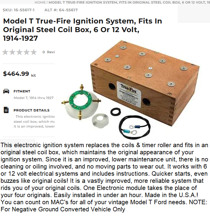 and 12 VDC and replaces the original commutator and coils on your Model T Ford