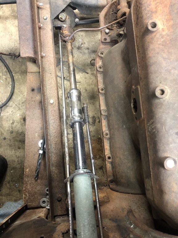 Working on my speedster. I was just about to drill 3 holes for the 22-25 steering column bracket I had clamped to the dash for the T steering column that I already had modified to fit when I thought, I wonder if I could make the Overland column work? So I tried it, then I took it apart, shortened and fitted it. I still have to finish the bottom parts of the spark and gas rods that I extended and make a bracket for the spark rod at the bottom. I welded 1/2 of a Model A brake drum to the firewall so it would look neater. I need to figure out the upper floorboards next.