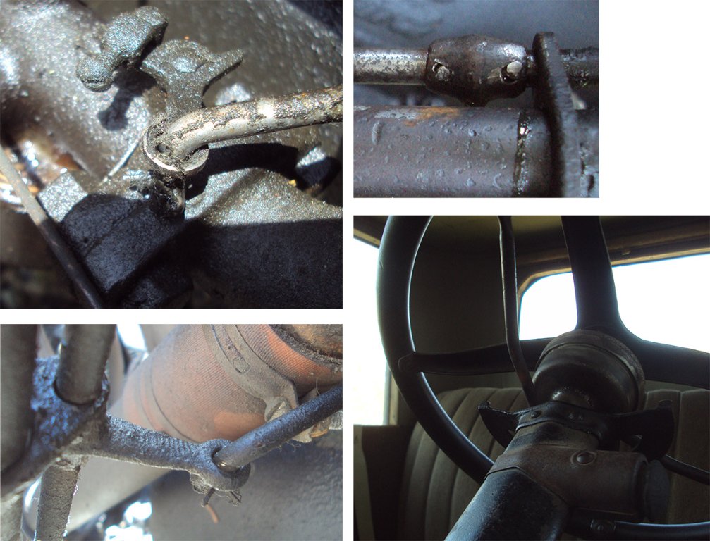 The Coupe acceleration had dwindled to 2 speeds over the Winter. A fast speed and idle with a long swing of the lever in between. Yesterday it was warm enough to investigate the problem. I found 5/8" of linear travel in the carburetor pull rod. The lever pin had worn quite a slot in the throttle rod. I have never seen one this bad. Only one pin was evident, so I drilled a hole for the second one to do the work. A finishing nail had been in place, head and all, showing evidence of a previous fix. As it had worked pretty well when I first started using this steering column, I assume rust had held the lever more solidly until the recent problem. "Good Old Rust".