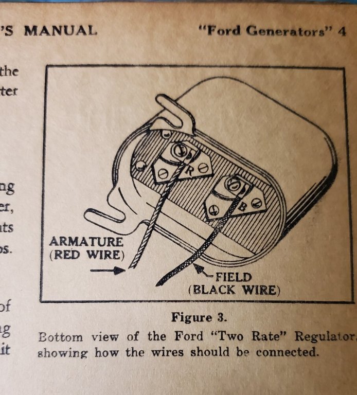 I don't mean to drift off topic, but I believe this is what you are thinking of. Ford called it the "2 rate regulator". It was not entirely successful and if I recall correctly, was only used for 2 years on radio equipped cars.ModelTWoods wrote: ↑Sun May 21, 2023 12:16 pmStephen, you are absolutely correct. After you replied, i remembered the 34 cutout was elongated but had more gently rounded corners than the one shown in the above posts.ndnchf wrote: ↑Fri May 19, 2023 6:04 pmThanks for your reply. But you are thinking of the early, 2-charge regulator that was optional on mid-1930s radio equipped cars. It is larger and oval shape.ModelTWoods wrote: ↑Fri May 19, 2023 5:54 pmI'm certainly not going to say that it isn't from 1919-1927 years, but my first thought was 1933-34 Ford V8. When Ford started offering an AM radio in 1933-34, as optional equipment, they used a regulator with radio equipped cars that wasn't round. I used to have a 34 four door sedan that had a center control AM radio that had a similar cutout.