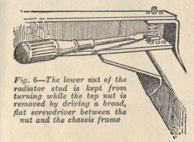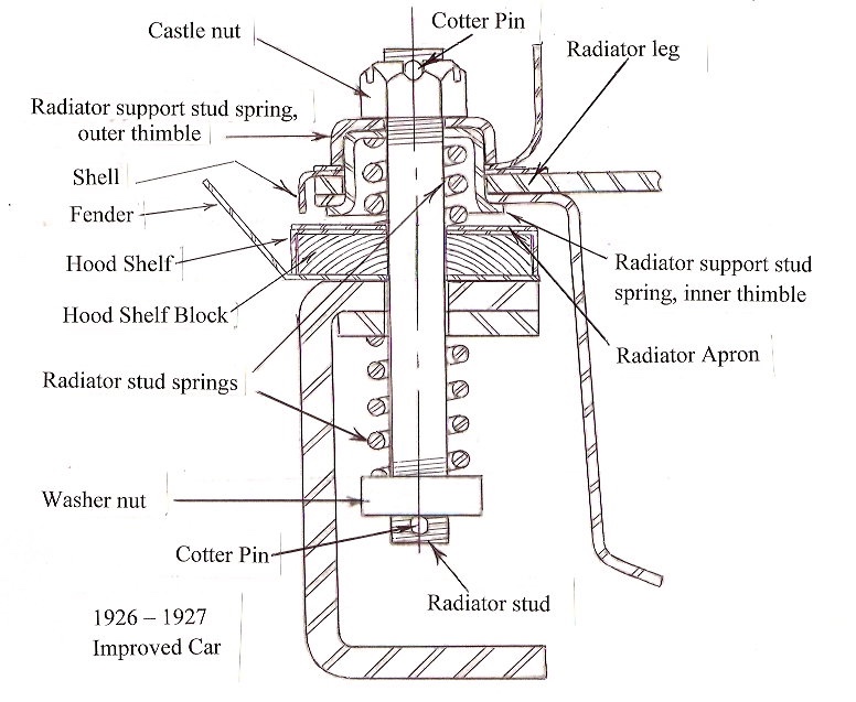 1927 Touring, I can not see a way to mount the radiator with the springs, without having the radiator mounted solid to the hood shelf. the picture shows where the mounting hardware would end up if the springs where fully collapsed, using new spring, which when collapsed are shorter than the originals.