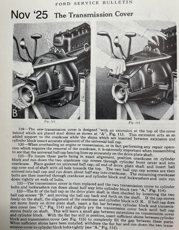 That new transmission cover for the Improved Car is shown in Nov. 1925 Service Bulletin, sans the straps. Gives info that the bolts and shims used are to secure the 4th main, to keep it true on the driving plate shaft.