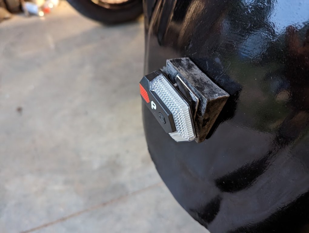 Here are some pictures of how I mounted the bicycle lights on my 1926 Roadster. The front and rear wedges are 3-D printed with a curve to fit the fenders. They have recesses for the six magnets, three to attach to the fender and three to attach the light to the wedge. I will be attaching cloth to the wedge to keep it from scratching the body.