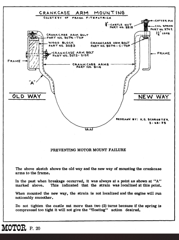As for that spring on top, and the comment at fracture point 'A' in that sketch, have found most times crankcase arms are busted at the top, where all the stress is found. Putting only one bolt and a small radius rod ball cap spring there, and no wood block or side bolt allowing the arm to pull away, wouldn't stop fractures like these: