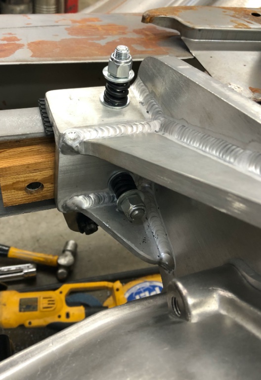 A potential problem with the bolt & spring method is the fact that such an arrangement will allow the motor mount to wear into the top of the frame, since it will shift constantly when the motor is running due to vibration and the frame flexing as the vehicle moves. The flanges on the motor mounts may also cut notches in the inboard edge of the upper frame flange. You don't want any kind of wear on the frame itself, either at the bolt hole in the upper flange or on the top surface of the flange. I've seen old frames with deep wear from loose motor mounts rubbing on the top of the frame. You don't want anything to weaken what is already a weak point, and if wear is present, you don't want to add to it. An enlarged motor mount bolt hole in the frame flange, or notches at the edge of the flange, are likely to lead to a broken frame. A weakened frame is also more likely to sag.