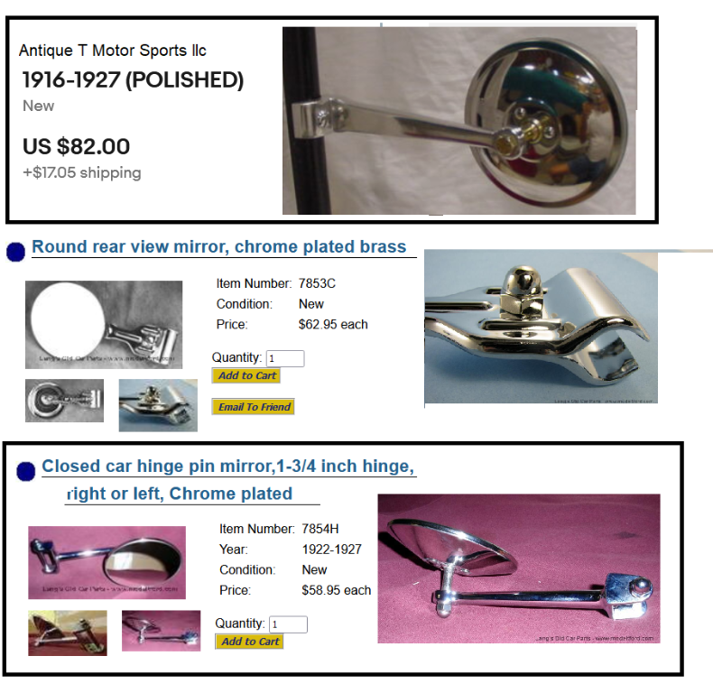 The very best rear view mirror is sold by Antique T Motorsports. Bill Bohlen take pride in his product and his mirror is, by far, superior to all other rear view mirrors. The cost of producing these mirrors has gone up and they are more expensive than other mirrors, but they are a great value, and thery WORK!!