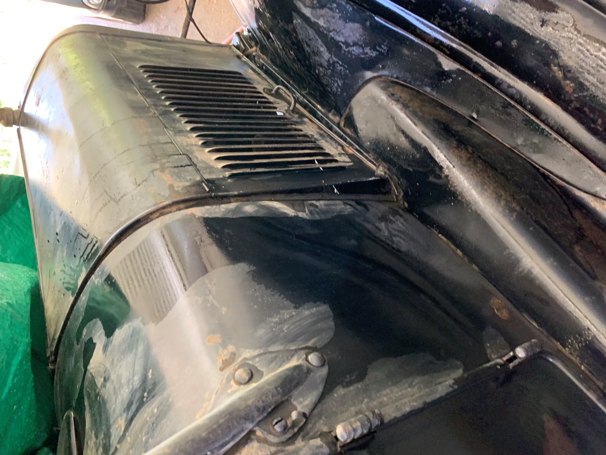 '26 with 3 holes for stanchion, and note the tiny hole in upper left of cowl, there are 4 of these rivet holes, spaced pair ea. to rivet the gas tank webbing anti-squeak inside the cowl. The '27 does not have tiny holes in the cowl, as a cardboard piece molded to fit inside the cowl is used on the later car.