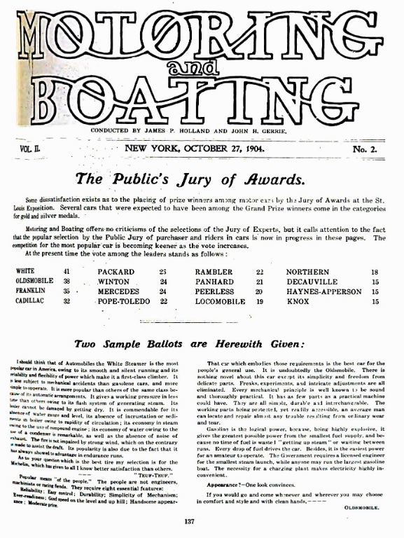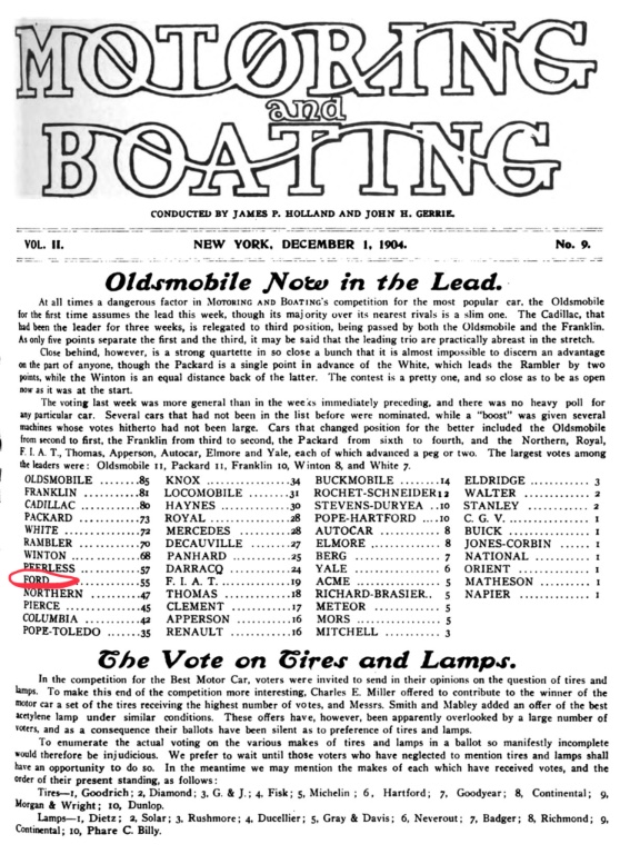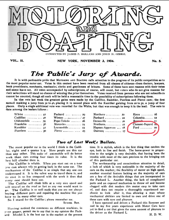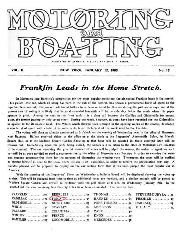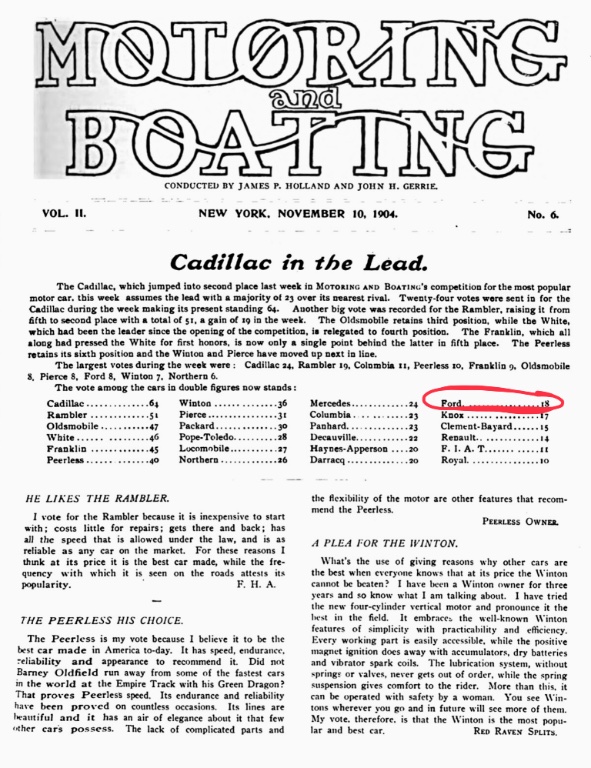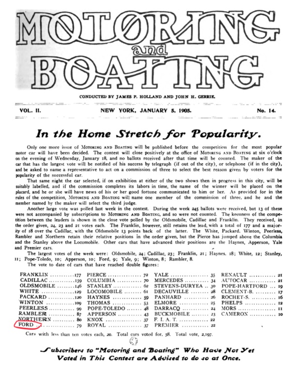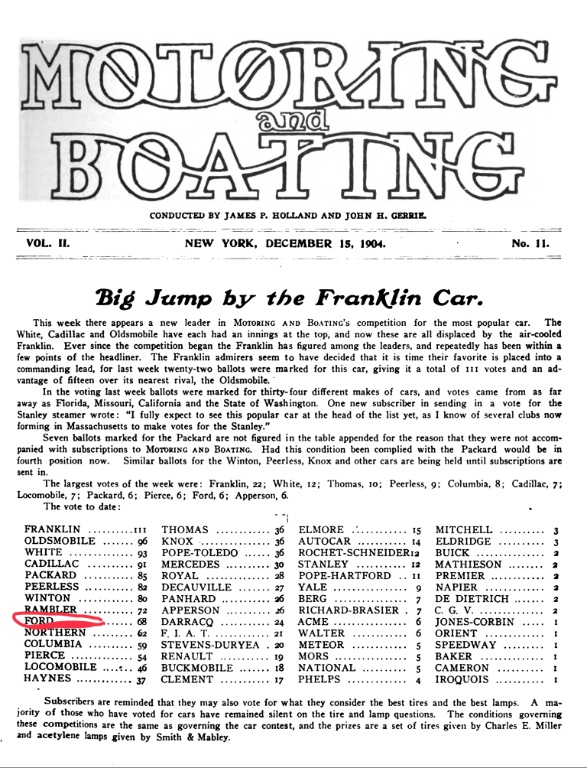“Motoring and Boating” began listing the competition weekly on October 27, 1904. Ford did not make the published list of 16, evidently receiving less than 15 total votes as “best motor car.”