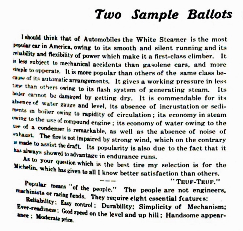 Ballot descriptions of the two leaders, White (steam) and Oldsmobile, were included: